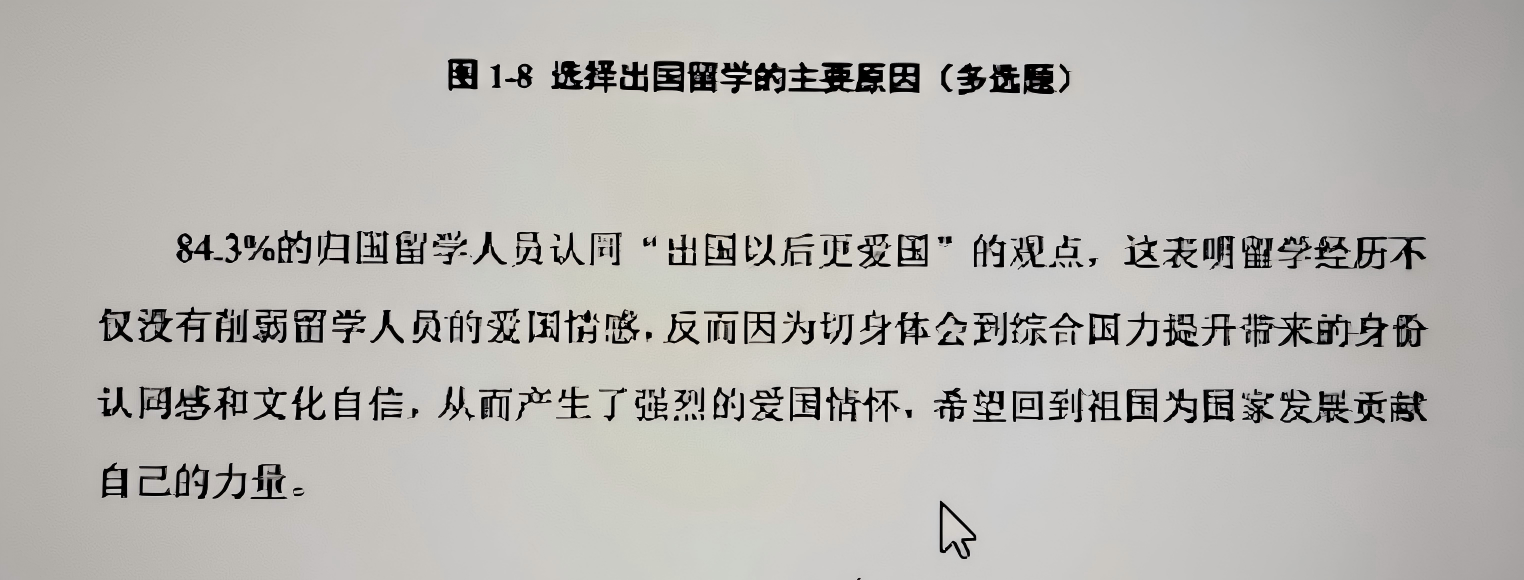 蓝皮书中还指出,84.3%的归国留学人员认同“出国以后更爱国”的观点,这表明留学经历不仅没有削弱留学人员的爱国情感,反而因为切身体会到综合国力提升带来的身份认同感和文化自信,从而的产生了强烈的爱国情怀,希望回到租过为国家发展贡献自己的力量。