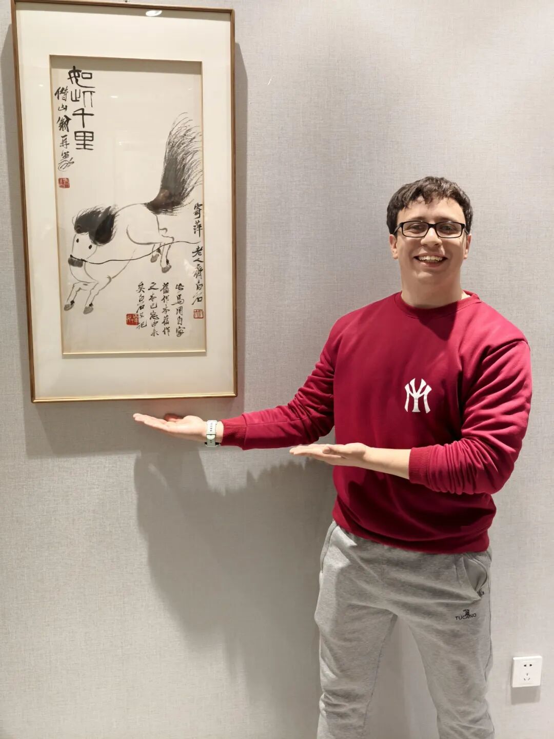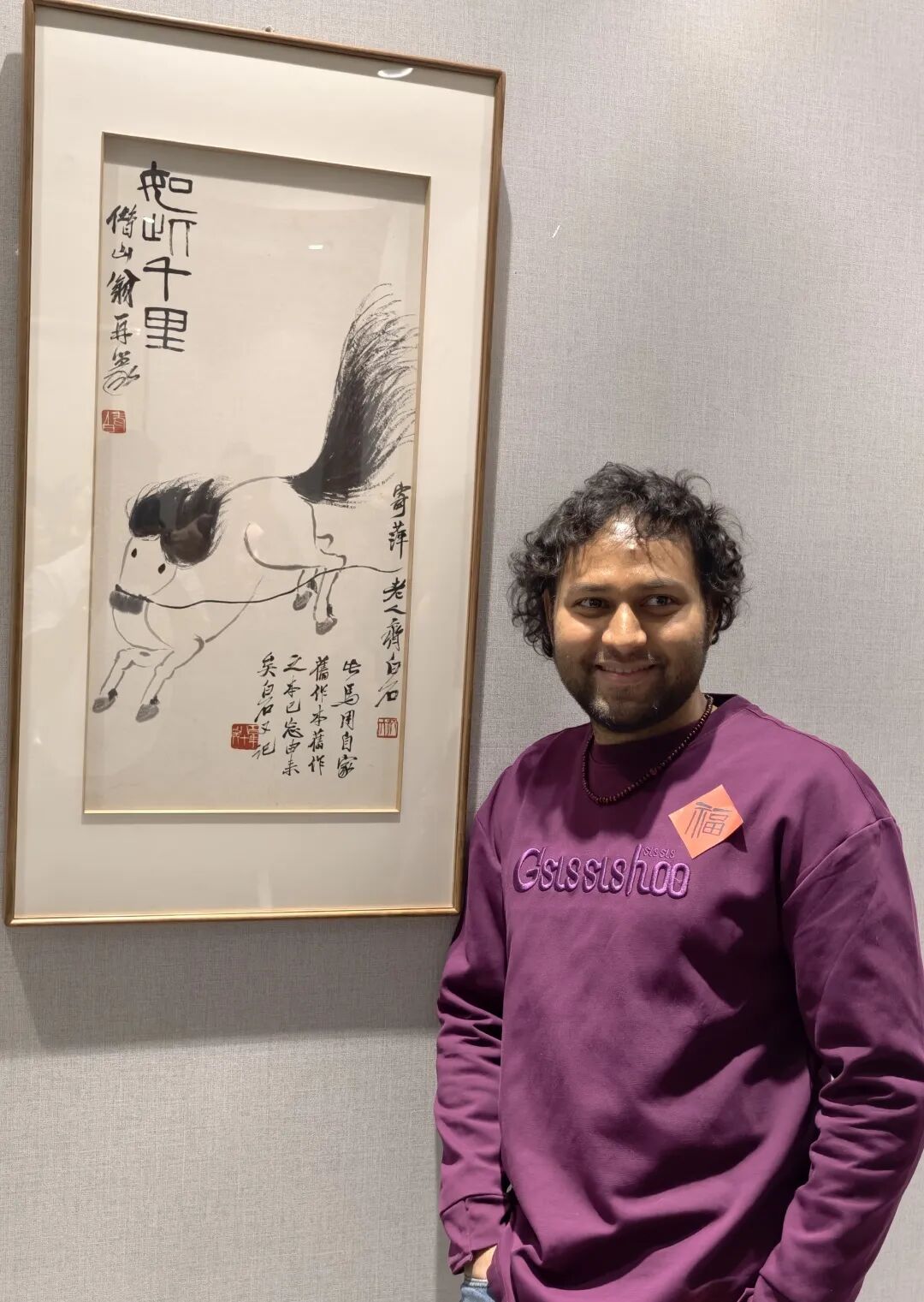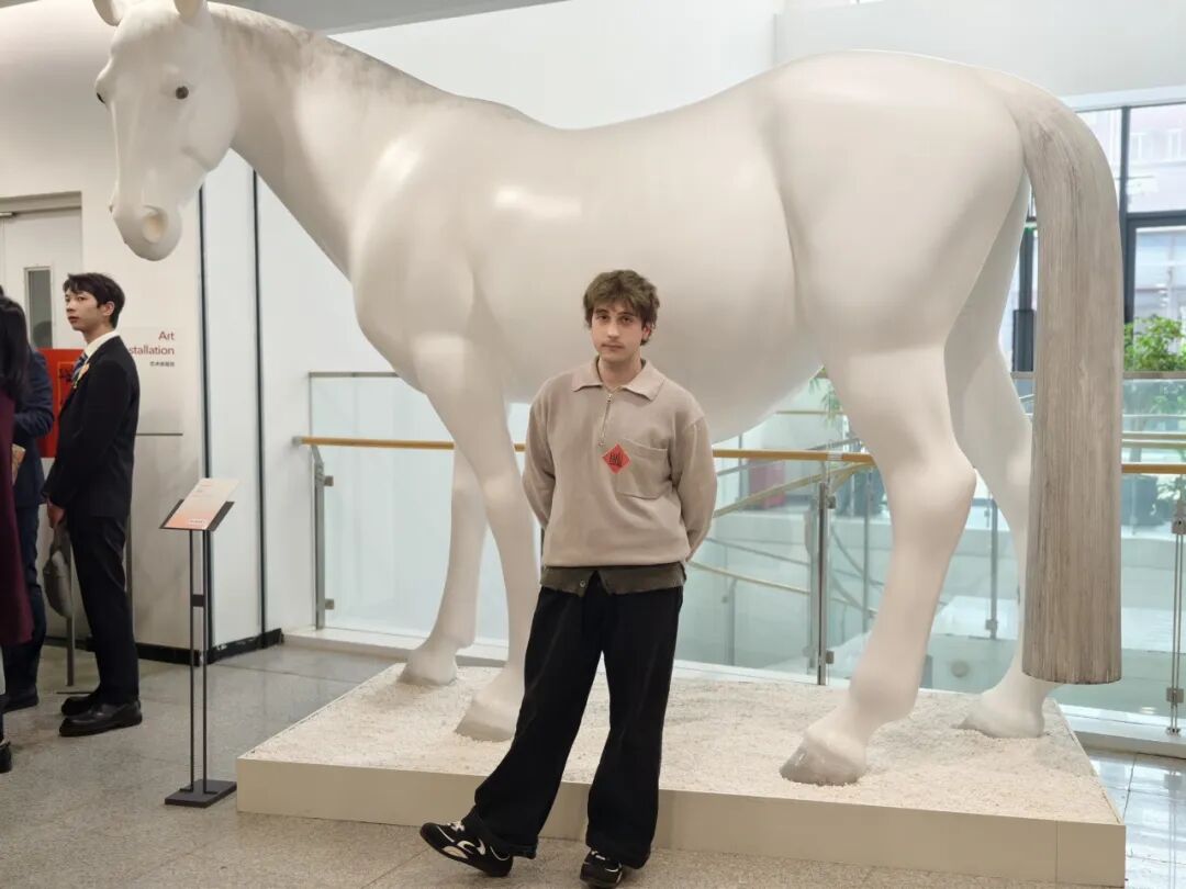 来自美国的达励恩同学和来自意大利的福冬冬同学轮流在一座马雕像前合影留念。令达励恩印象最深刻的是,此次展览全程提供中英双语,有助于他进一步理解本次展览的文化内涵。他还展示了此次活动的纪念礼物——灵感源自齐白石《如此千里》的热门文创“马彪彪”手提袋以及书签、香囊等。“我喜欢马彪彪的鬃毛。”达励恩说。福冬冬提到,“我在中国学习和生活已经2年了,觉得中国文化很有意思,比如:中国的新年文化跟意大利就不同,我们通常会说‘新年快乐’‘祝你健康幸福’,在中国有马年独特的文化内涵,会送上‘马到成功’‘马上发财’这样的祝福。今天我还参与活动写下了属于自己特有的‘福’字,感受了中国古典音乐韵味,加深了对中国传统文化的认识。”